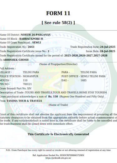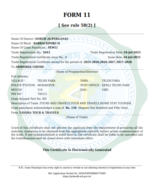 Welcome to Tanima Tours & Travels, your trusted partner in creating memorable journeys. Founded in 2004 by Mr. Abhishek Ghosh, our mission has always been to provide exceptional travel experiences tailored to your dreams. With over two decades of expertise, we pride ourselves on our commitment to quality, reliability, and personalized service. We believe that travel is not just about visiting new places, but about creating lasting memories.